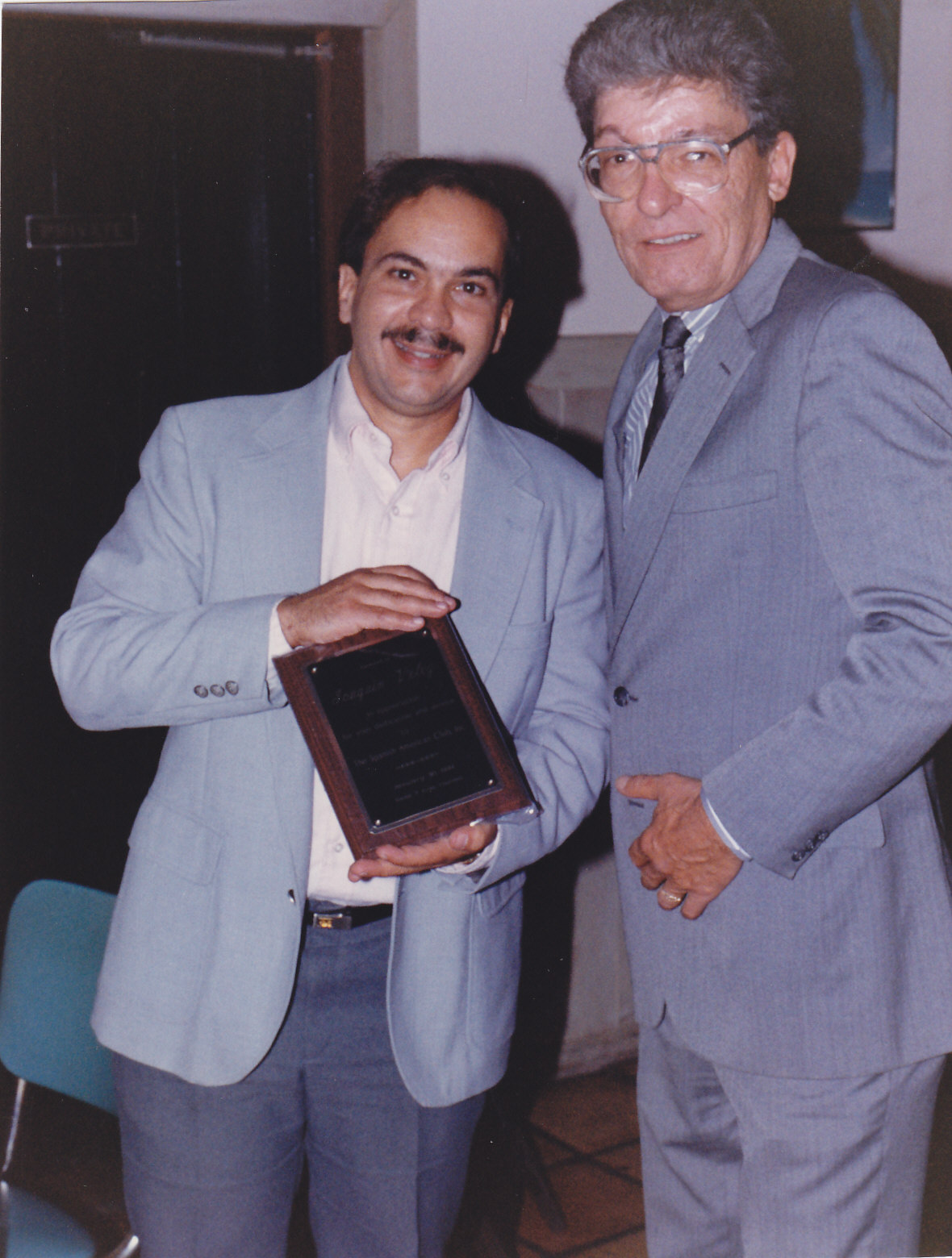 Member of the Board of Directors are awarded plaques for their service and dedication to the club at the Annual General Assembly on Saturday, January 30th, 1994, at Don Ramon Restaurant. Elected President Tom González presented Joaquin “Kino” Vélez a plaque for his service and dedication to the club.